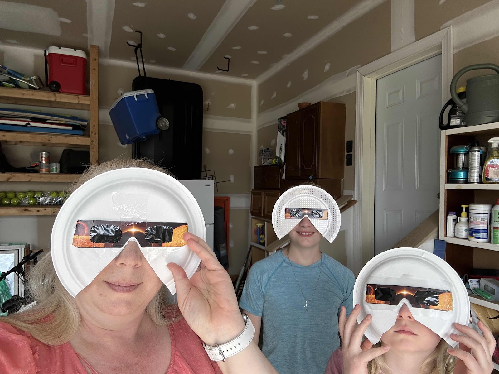 Today we had the pleasure of seeing an 87% total eclipse of the sun by the moon at around 3:15 PM. The kids were all pretty excited about it. I decided to get the younger two out of school early so they could come home safely and enjoy it with us. we tried to make an afternoon of it. We got the viewing glasses luckily at the last minute. I made viewing masks out of them. The idea was fully protect our eyes from looking up even around the edges. It’s a good thing I made those because Claire would’ve never ever been able to look up. She struggled to look up , even with the full plate coverage.